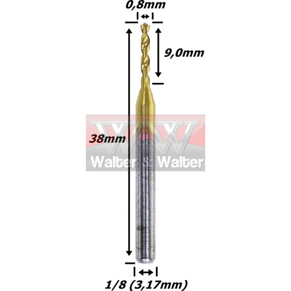 Broca Pcb Banho Titânio 0,8mm X 9,0mm Corte X 38mm Total X 3,17mm (1/8) Haste. (Ftr1799)