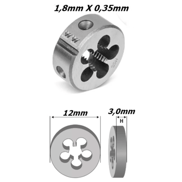 Descrição Cossinete M1,8 x 0,35mm Rosca Paralela. Diâmetro: 12mm. Altura: 3,0mm.