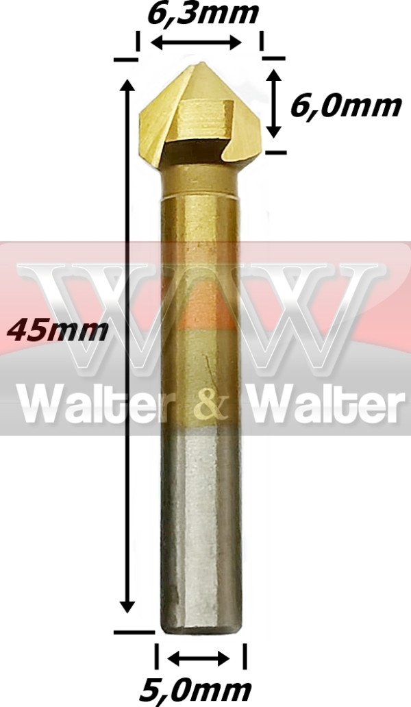 ESCARIADOR ( 6,3MM ) 3 CORTES ( 90° ) MATERIAL: HSS AÇO RÁPIDO TITÂNEO TRATAMENTO DE SUPERFÍCIE: REVESTIDO DE TITÂNIO CHANFRO DE TRÊS CORTE DE TITÂNIO ENCAIXE HASTE 5MM USO: PERFURAÇÃO DE MADEIRA - FERRO - AÇO - E METAIS NÃO FERROSO IDEAIS PARA, PLÁSTICO, ALUMÍNIO – ACRÍLICO E OUTROS MATERIAIS MOLE