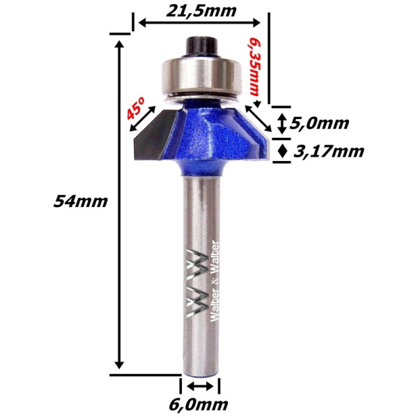 Fresa Chanfrar Ø21,5mm (90º) 5,0mm Raio X 6,35mm (1/4) X 6,0mm Haste. (Ftr3500)