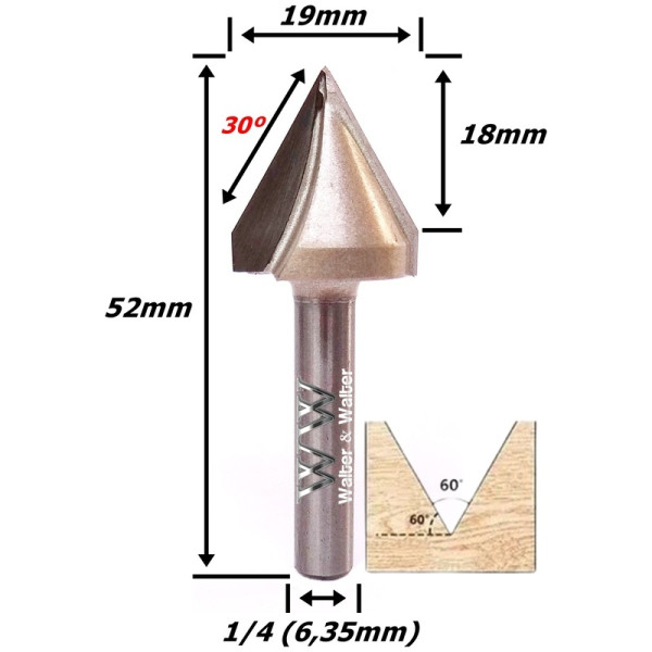 Fresa V Bit Ø19mm X (60°) X 19mm Corte X 6,35mm (1/4) Haste. (Ftr1750)