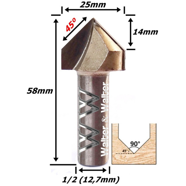 Produto: Fresa V Bit Ø25mm X (90°) X 14mm Corte X 12,7mm (1/2) Haste. (Ftr2801)