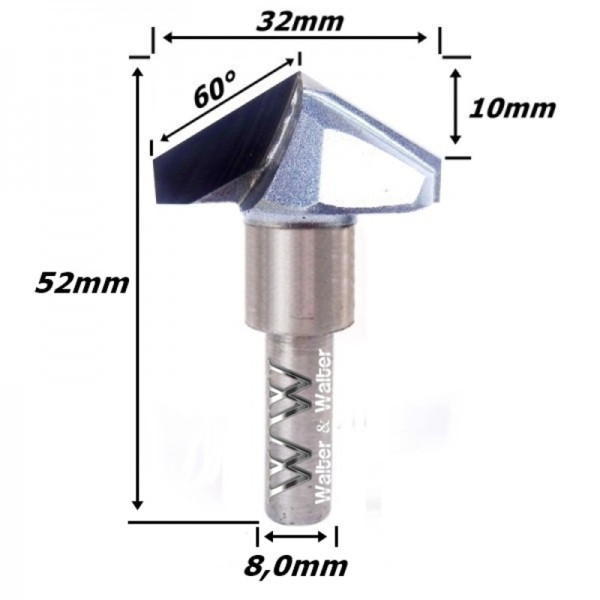Produto: Fresa V Bit Ø32mm (120°) X 10mm Corte X 52mm Total X 8,0mm Haste. (Ftr3283)