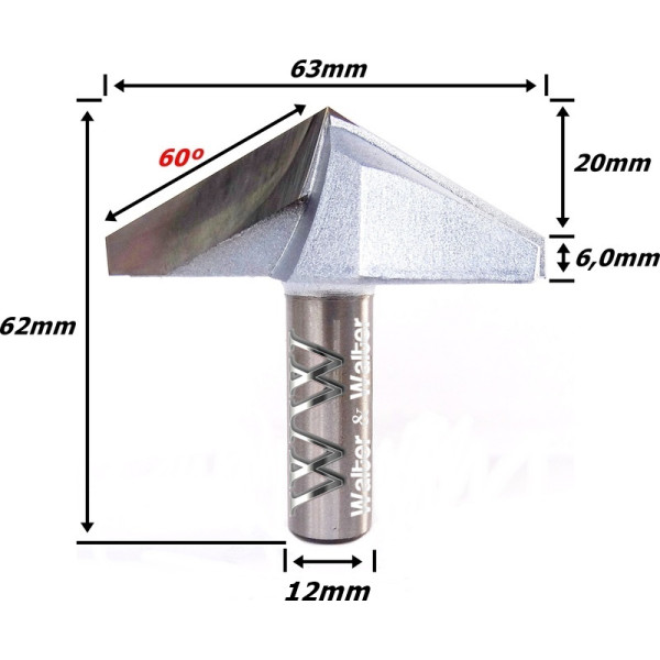 Produto: Fresa V Bit Ø63mm (120°) X 20mm Corte X 50mm Total X 12mm Haste. (Ftr0731)