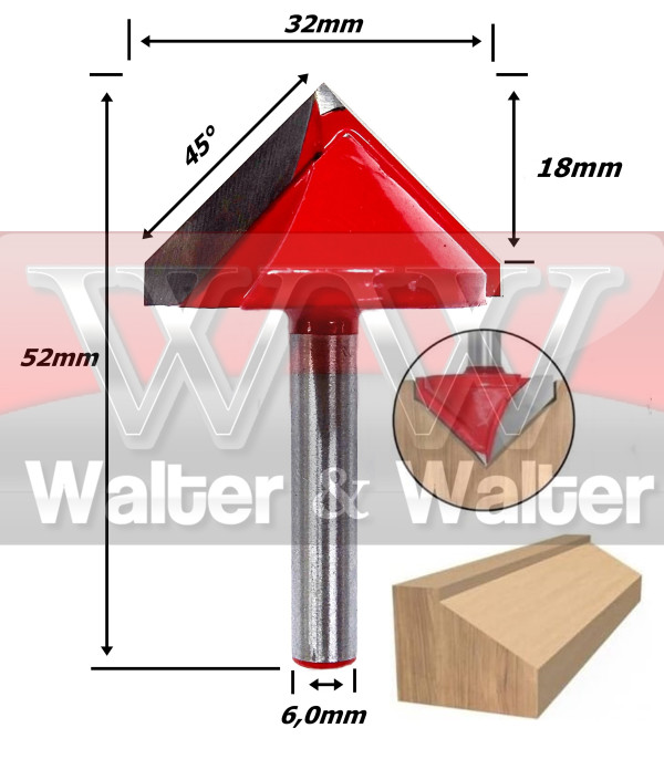 Produto: Fresa V Bit Ø32mm (90°) X 18mm Corte X 52mm Total X 6,0mmhaste. (Ftr0071)