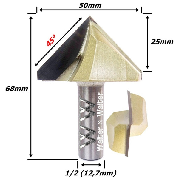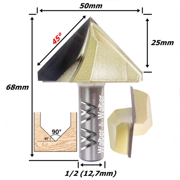 Fresa V Bit Ø50mm (90°) X 25mm Corte X 68mm Total X 12,7mm (1/2) Haste. (Ftr0649)
