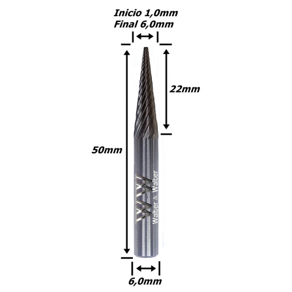 LIMA ROTATIVA CÔNICA INICIO 1,0MM X 6,0MM FINAL X 22MM CORTE X 6,0MM HASTE. INDICADA PARA DIVERSAS APLICAÇÕES EM MATÉRIAS DE QUALQUER DUREZA,LIMA ROTATIVAS METAL DURO SÃO UTILIZADAS PRINCIPALMENTE NAS SEGUINTES APLICAÇÕES: PROCESSO DE REBARBAÇÃO EM GERAL, DESBASTE EM CORDÃO DE SOLDA E ABRIR TRINCAS, FAZER TALHO PARA SOLDAGEM E OPERAÇÕES QUE DEMANDEM REMOÇÃO EM DIVERSOS TIPOS DE MATERIAIS.