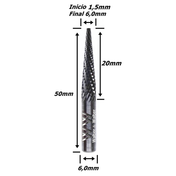 Produto: Lima Rotativa Cônica 1,5mm X 6,0mm x 20mm Corte X 50mm Total X 6,0mm Haste. (Ftr2575)