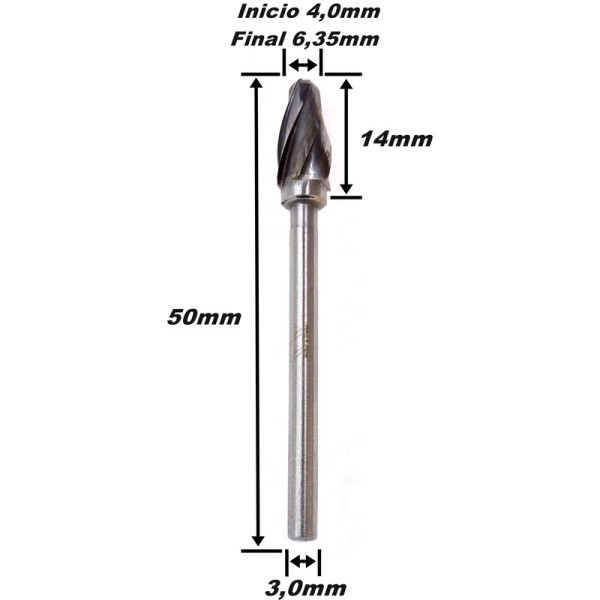 4,0MM X 6,35MM (1/4) DIÂMETRO X 14MM ÁREA DE CORTE X 50MM TOTAL X 3,0mm HASTE