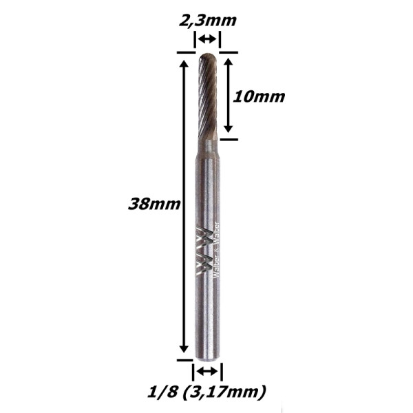 2,3MM DIÂMETRO X 10MM ÁREA DE CORTE X 38MM TOTAL X 3,17mm (1/8) HASTE