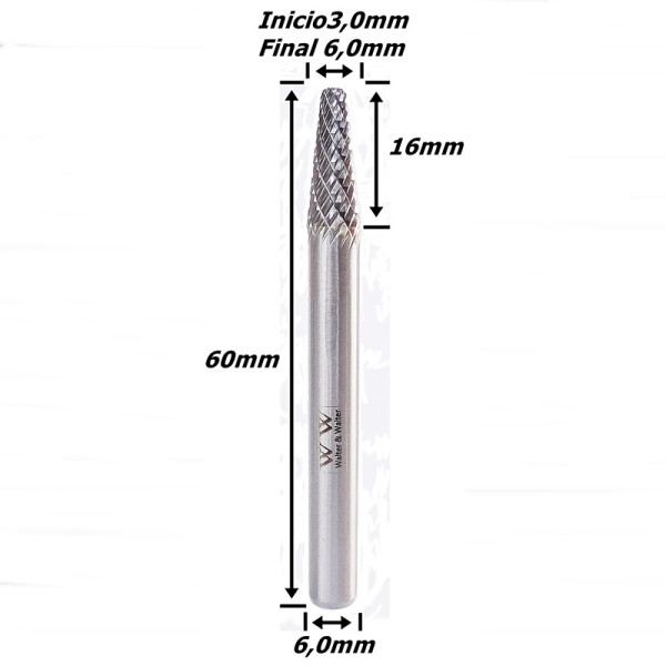 Produto: Lima Rotativa Cônica Esférica 6,0mm X 16mm Corte X 60mm Total X 6,0mm Haste. (FTR3393)