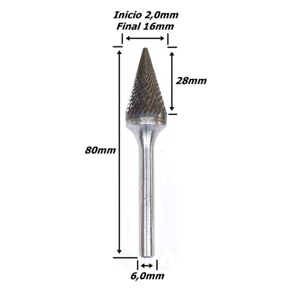 Lima Rotativa Cônica 2,0mm X 16mm X 28mm Corte X 80mm Total X 6,0mm Haste. (Ftr220)