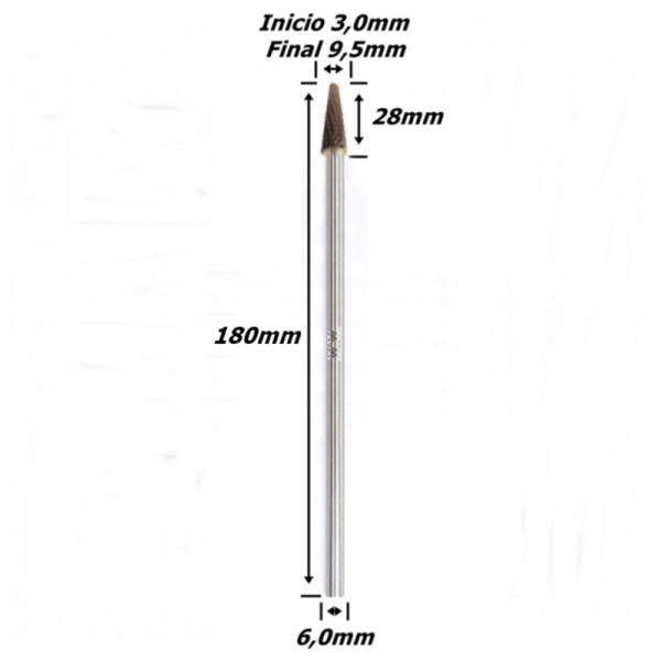 Produto: Lima Rotativa Cônica ø9,5mm x 28mm de Corte x 180mm Comprimento x 6,0mm Haste. (Ftr0961)