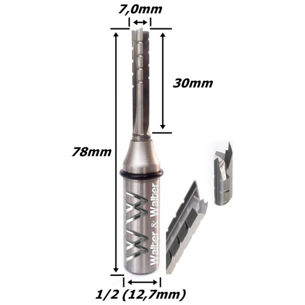 7,0mm (2 cortes) x 30mm área de corte x 78mm total x 12,7mm (1/2) haste.