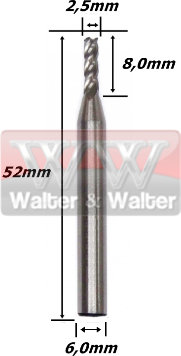 Produto: Fresa Topo Reto 2,5mm Din 844 Hss (4c) X 8,0mm X 52mm X 6,0mm Haste. (Ftr1199)