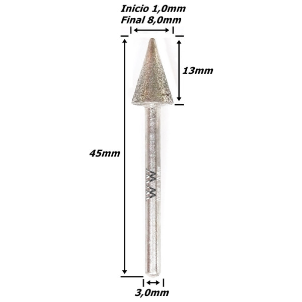 Ponta Diamantada (Conica) 1,0mm X 8,0mm X 3,0mm Haste. (Ftr2730)
