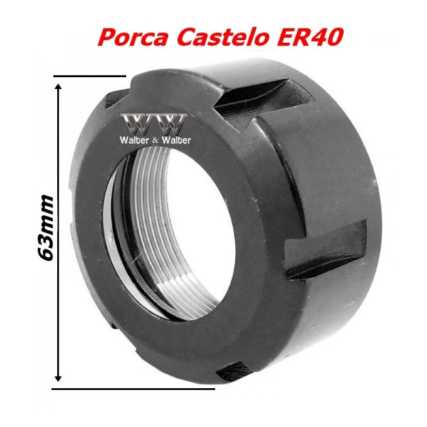 A PORCA CASTELO ER40 FAZ A FIXAÇÃO DA PINÇA NO PORTA PINÇAS, QUE É FIXADO AO EIXO DO SPINDLE/MOTOR.